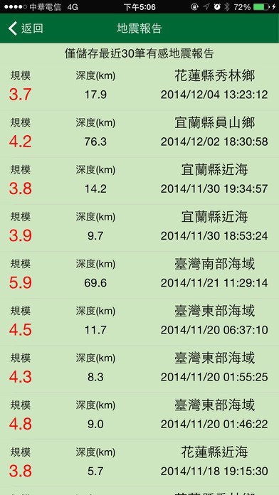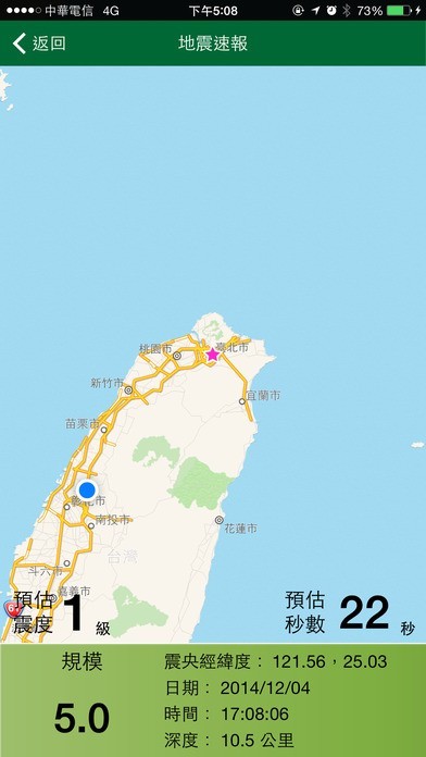 快速掌握中央氣象局所發佈之地震速報,透過網路傳遞與即時推撥機制,提供使用者得知還會有多少秒數,即感受到地震波的影響,並以警示音效與震動倒數的方式,提醒使用者提前進行預防反應的處置;即使在休眠狀態也可以收到速報提醒。