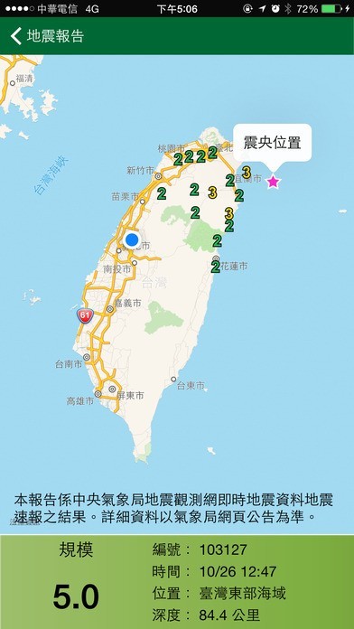 與中央氣象局同步,將最新的地震報告完整的呈現震央相關資訊,包含震央所在地的標示、震度大小、震源深度以及周圍地區的影響級數。