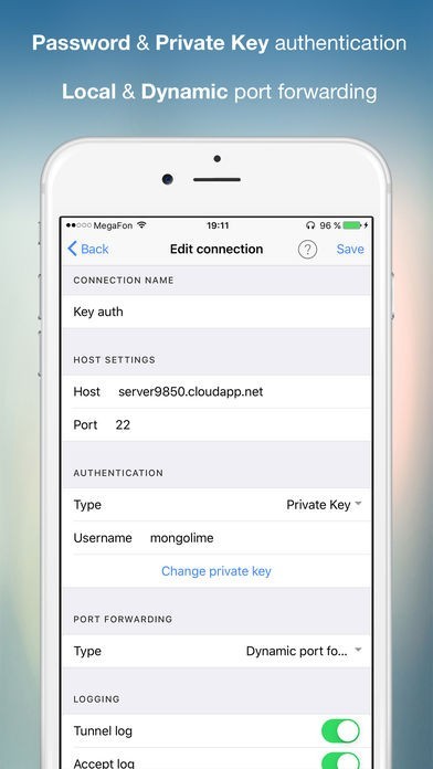 - Supports local and dynamic port forwarding