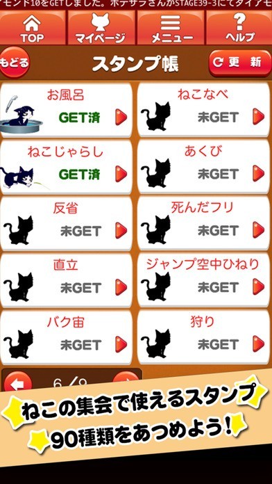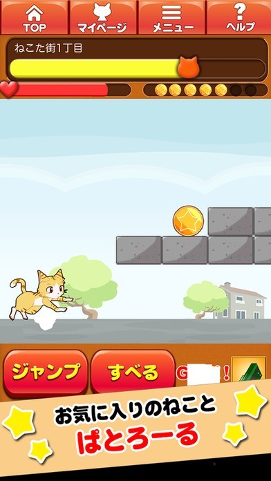 かわいい猫のキャラクターを操ってステージをクリアしていく、横スクロール型のアクションゲームです。猫は3種類いてそれぞれ能力が異なります。ジャンプとヘッドスライディングをすることができ、これらを駆使して障害物を避けたりメダルを集めます。獲得したメダルはネコインに交換でき、ネコインを使ってアイテムを購入して猫をドレスアップすると共に能力もアップできます。 他のユーザーと交流したり、プレゼントできるなどソーシャル性も兼ね備えています。