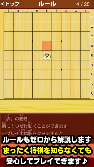 将棋のルールから基本的な勝ち方の解説も行っており、漢字にはルビが振ってありますので、将棋をやってみたいというお子様に是非すすめてください。 また、知り合いを将棋の世界に引き込みたい場合にも本アプリを紹介していただければ幸いです。