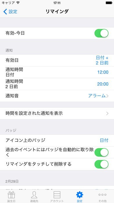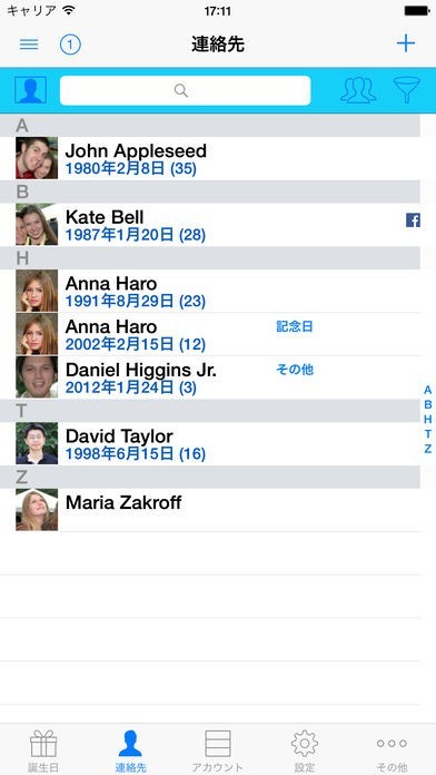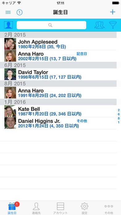 スマホのアドレス帳と同期しているので、友人家族の誕生日を忘れることなく迎えられます。他にも結婚記念日などの大事な日はアプリに直接入力することで追加できるので、便利です。
