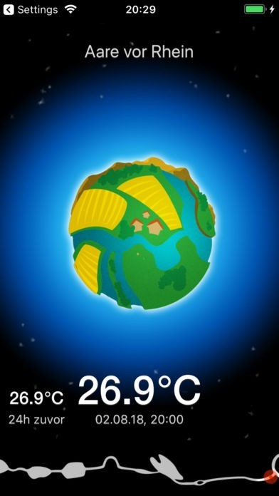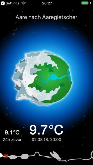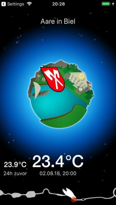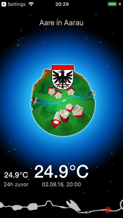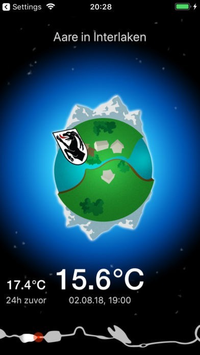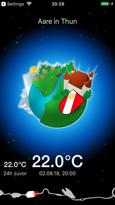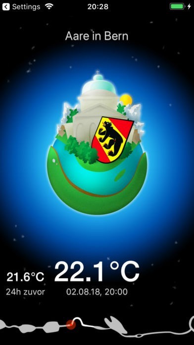 App Storeより引用Aare App zeigt die aktuelle Temperatur der Aare an. Vom Aaregletscher über Interlaken, Thun, Bern, Biel, Solothurn, Aarau bis ins Wasserschloss der Schweiz. Schön und schnell.