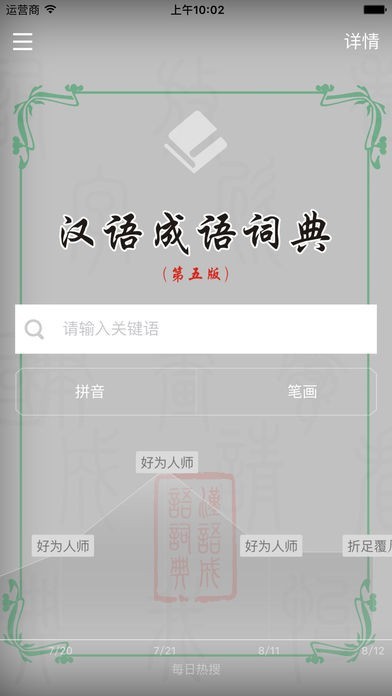 App Storeより引用原版内容,正版发行。全国优秀畅销书,《汉语成语词典》2014年1月第5版第9次印刷手机版同步发行,由长期从事语言文字教学与研究的专家、学者编写,是一本适合中等文化程度的读者使用的优秀中型成语词典。