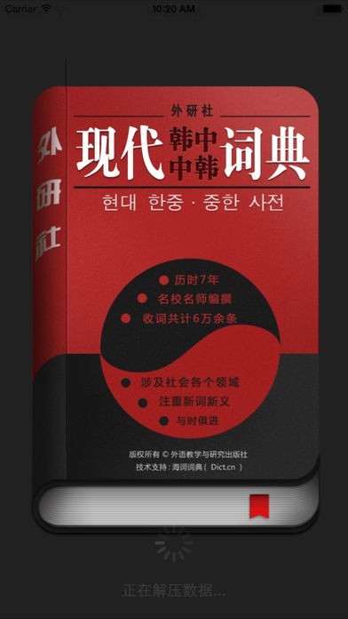 App Storeより引用外研社畅销词典,韩语学习者好帮手。《外研社现代韩中中韩词典》于2004年4月初版发行,手机版与2012年12月第12次印刷版同步,是韩语单词查询的便捷工具,也是韩语阅读、韩语写作、翻译查询的得力助手,共收录词条六万余条,以日常生活为主,囊括政冶、外交、法律、经济贸易、文学、历史、文化、社会、教育、体育、旅游等多方面内容的中韩词语,词条包括韩语的条目、词性、释义、例句,还列出部分词条的同义、近义和反义词等。为更好地体现韩国当代生活,本词典多收新词新义、外来语。