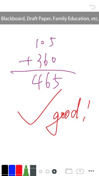 This app is perfect. Simple and effective. Just what I need. Three colors and three thicknesses. A blank white space. One finger writes, two erases, three clears the board. Perfecto!