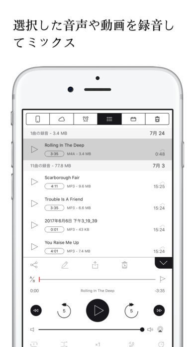 「ディクタフォン (PRO)」では、録音した音楽をその場で好きに編集できます。速度調整はもちろん、他の音楽をミックスしたり着信音を作成することもできるため自由な使い方ができます。