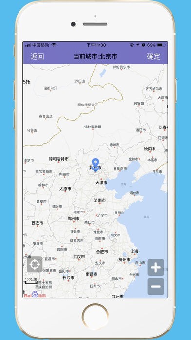 2.选择城市:独创的通过地图拖动选择城市功能,自动定位城市。
