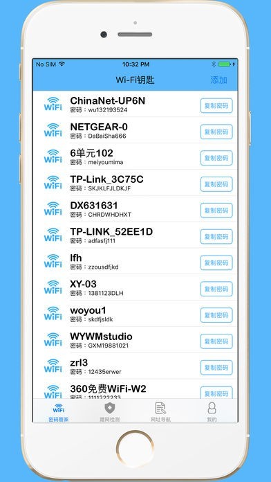 这是一款智能WiFi密码管理工具,支持蹭网检测和网址导航功能,为您安全免费上网保驾护航,是朋友,同学,家人之间共享密码的一款好用的工具。