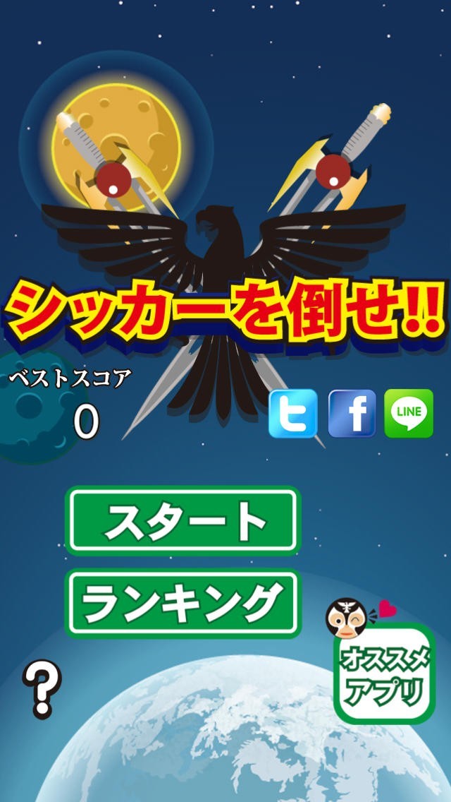 「シッカーを倒せ!」は、某ライダーの敵に似たシッカー達を撃って倒す、シューティングカジュアルゲームです。 ゲームを始めると、荒野や宇宙等ランダムで選ばれた背景に、顔だけの可愛いシッカー達が飛んできます。 操作はタップのみで、基本的な雑魚シッカー達はクレー射撃の様にタップして倒します。 途中ボスキャラが出現します。ボスキャラは一撃では倒せないので、連打して倒して下さい。倒すとボーナスゲームが始まり、雑魚シッカー達が沢山飛んできて、ポイントを沢山稼ぐ事が出来ます。 また、ライダー的な正義の味方は撃ってしまうとゲームオーバーなので、よく見極める事がポイントになります。