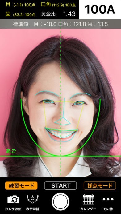 表情筋を動かすとリアルタイムで点数が変化するから、表情をどうすればよいか良くわかる。