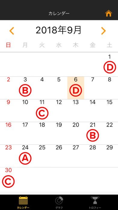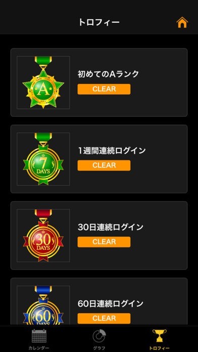 トレーニング結果がアプリ内のカレンダーに記録できるので、スタンプ集めの感覚で続けられる。各条件でトロフィーがGETできるので目標になる。