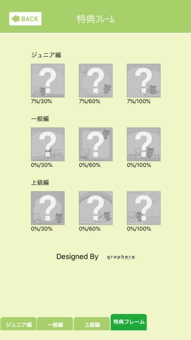 出題された問題を一定の割合で正解すると、ていたん写真フレームがプレゼントされる仕組みになっています。トータルで9種類フレームはあるので、コレクションするのも楽しいです。