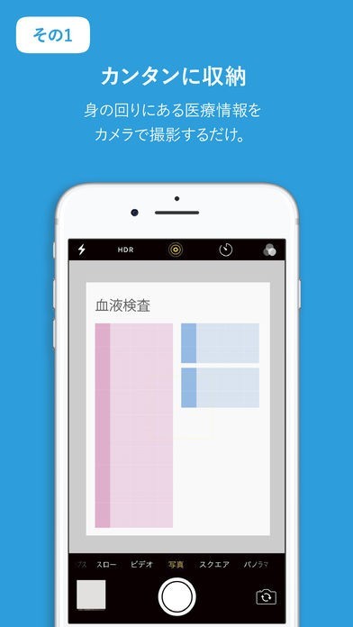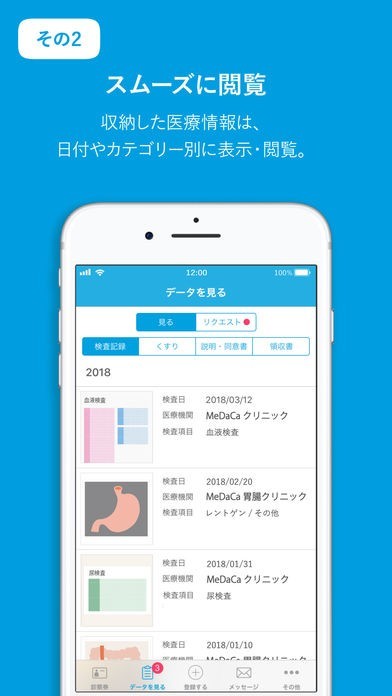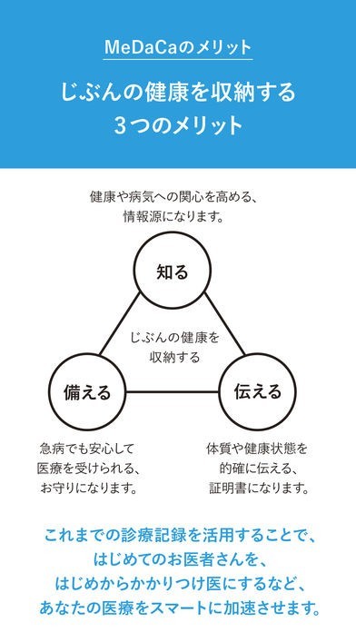 App Storeより引用◯ MeDaCaは、ご自分の様々な医療情報を写真で管理できるアプリです。診察券や検査データ、薬の説明書、健康診断書など、身の回りにあるたくさんの医療情報を、なんでも写真に撮って自分のスマートフォンに収納します。また、収納された医療情報は、日付・カテゴリー別に表示・閲覧することができます。