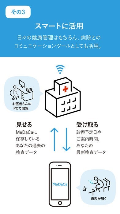 持病や服薬、アレルギー情報などを、的確にお医者さんに伝えられ、自分に合った医療をスピーディに受診。お医者さんも患者情報を正確に把握できるので、診療の助けになります。また、病院から診察案内などが配信され、待ち時間なくスムーズに治療を受けられるようになります。