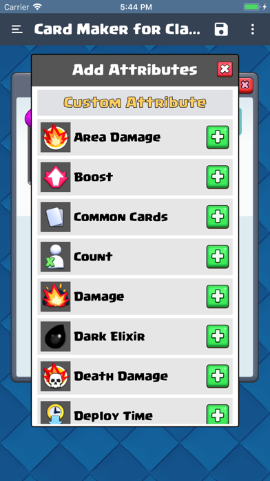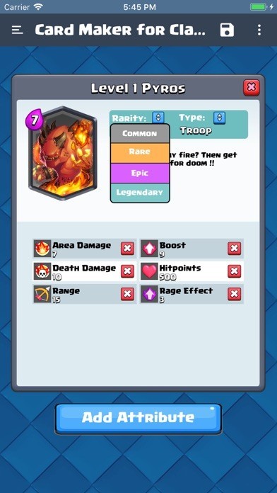 Clash Royale card can be selected from library and you can adjust the way you like it. You can select attributes from a list and give them value or you can add completely new custom attribute.