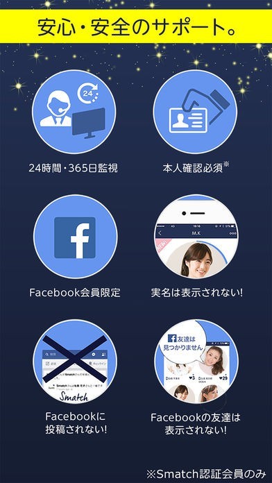 Facebookのアカウントデータを活用することにより、プライベートの友人や同僚などに見つかる心配を一切することなくマッチングを楽しむことができる、安心の婚活・恋活を売りにしているアプリがSmatch(スマッチ)です。もちろんFacebookのアカウントで登録したとしても、Facebookのタイムラインにアプリを利用していることがわかる表記は一切流れませんし、Facebookで友だちになっているユーザーは、アプリ上に一切表示されないように設計されています。