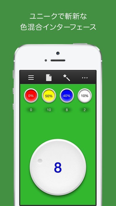 TrueColorは、色の配合を微調節して調べることができます。絵を描く人は、パレットで色を作る前に色の配合がわかるので、絵の具を無駄にすることなくスムーズに作れます。