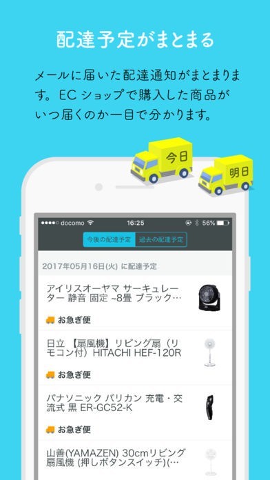 メールに届いた配達通知がまとまります。ECショップで購入した商品が、いつ届くのか一目で分かります。また当日にリマインド通知もされます。