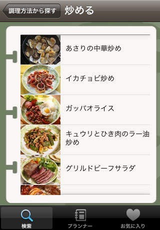 調理方法でレシピを検索できるので、利用するキャンプ場の設備によって作れる料理を確認可能!