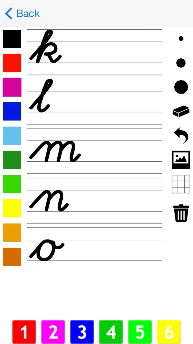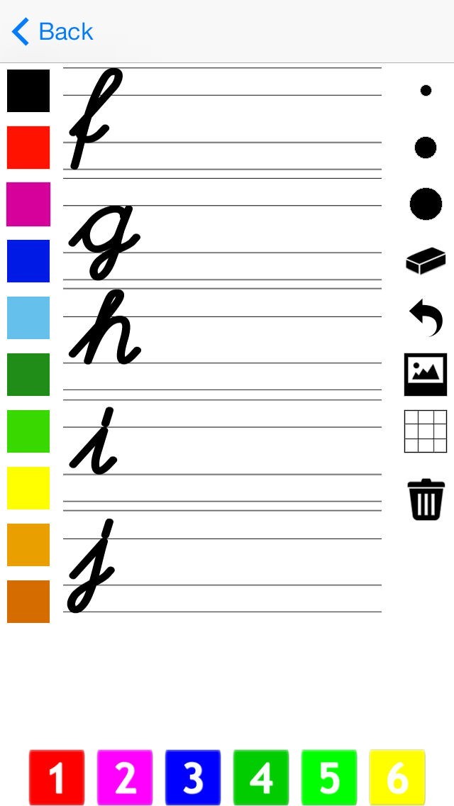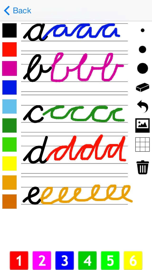 このアプリでは筆記体を楽しみながら学ぶことができるようにしてくれます。お手本に習って同じアルファベットを横に書き続けることによって学ぶことが出来るので、実用的に学ぶことが出来るようになります。 加えて、色を11色の中から選択することが出来るので、カラフルにすることによって楽しさを増大させたり、文字の太さを変えたりすることによって飽きずに学ぶというようなことができる工夫がなされています。 操作はなぞることによって出来、特別な要素はありません。