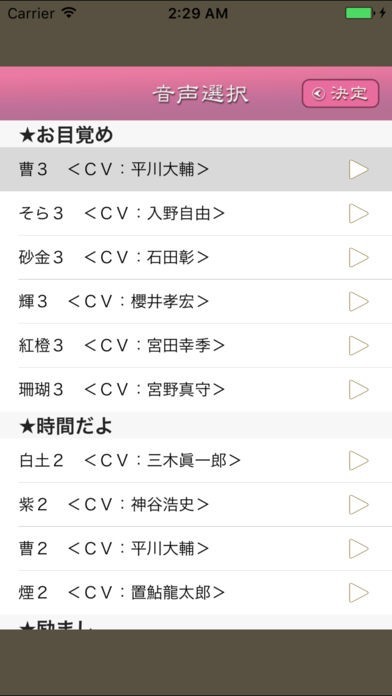 好きな声優のセリフをアラームに設定することができるので、毎朝幸せな気分で気持ちよく目覚めることができます。アラームは3つまで設定でき、スヌーズ機能も利用できます。