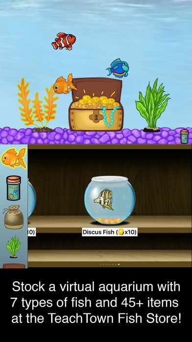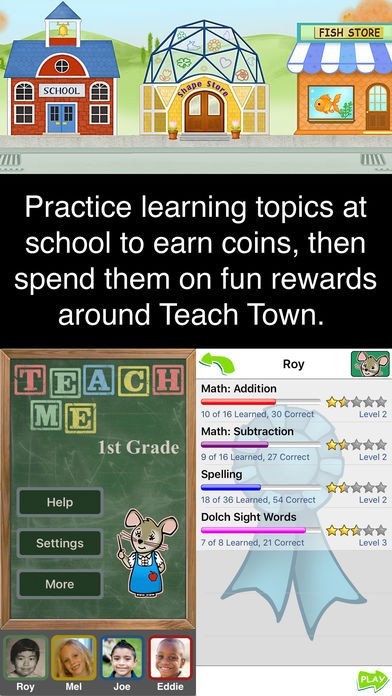 TeachMe: 1st Grade keeps children engaged with a unique reward system where children earn coins by playing learning games at the school. They can move around the rest of TeachTown to spend their coins on fun rewards. Children can collect stretchable shapes at the Shape Store, visit their virtual aquarium at the Fish Store, and decorate different scenes at the art store. The simple and intuitive user interface is designed to be child friendly, which allows children to play without help from an adult. An animated teacher (Mimi Mouse) gives verbal instructions and feedback to encourage the child to learn and succeed! In addition, the learning screens are colorful, fun and rotate between four different subjects so children don't get bored.