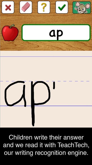 TeachMe: 1st Grade is the only iPhone app which reads your child's writing using TeachTech, 24x7digital's writing recognition engine. Children write their answers for math and spelling questions and TeachMe: 1st Grade reads them using TeachTech. If your child needs help, TeachMe: 1st grade will show them how to write the correct answer including the proper stroke order. TeachMe also includes a virtual keyboard input option.