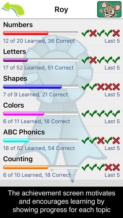 • Achievement screen encourages and motivates learning by showing progress for each topic.