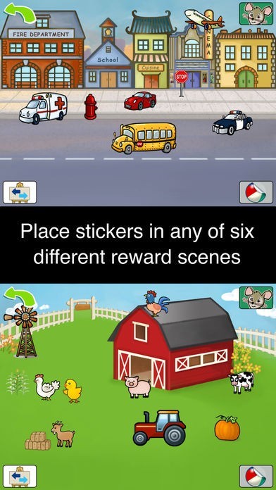 • 6 different sticker reward scenes: beach, underwater reef, pirate cove, city, farm and playground