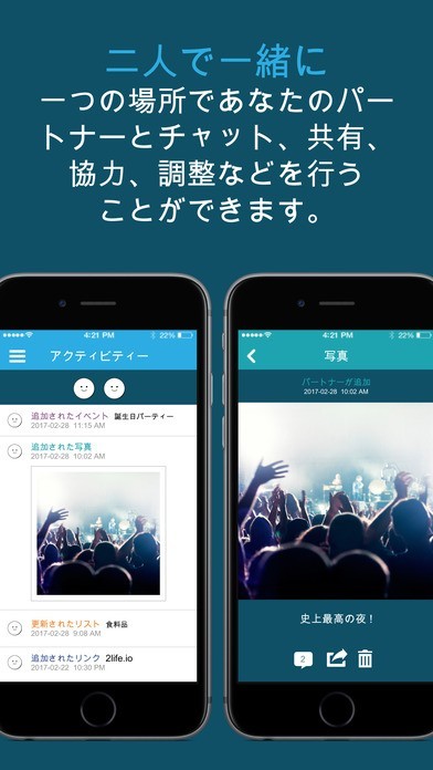 「2life」は恋人や結婚した方と使うのに適したアプリで、二人だけの絆を深めてくれることでしょう。 チャット機能では、ラインなどいろいろな方とコミュニケーションをとるのではなく、完全に二人だけの世界なので、他の方に邪魔されることはありませんし、プライベートな話もどんどんと気兼ねなく行えます。 また、カレンダーを共有することによって、お二人の予定が立てやすくなったり、忙しそうだから自分も同じ日に予定を入れようなどという判断を下すきっかけを与えてくれます。 さらには二人の思い出を記録しておいてあとから見たりすれば愛情をより深く感じます。