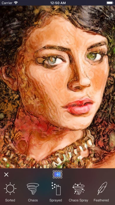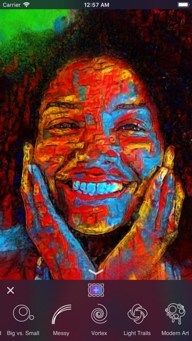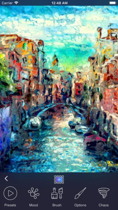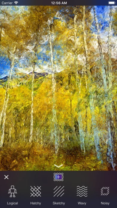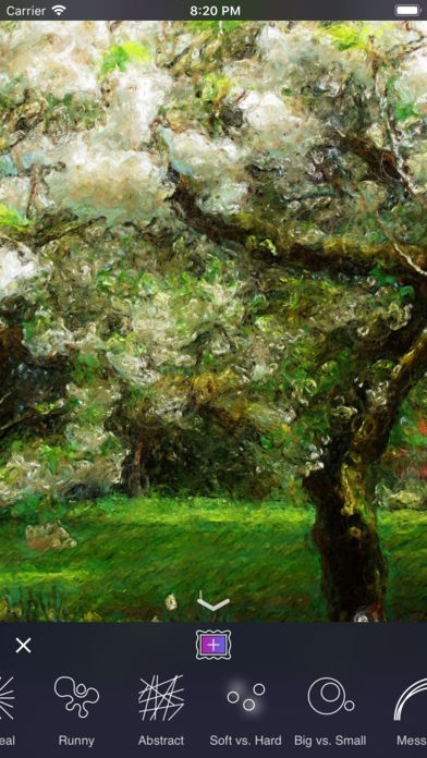 加工したい写真は、OpenImageから取り込み、タッチには写実的なものから飛沫など、油絵の技法が使えます。描かれていく過程が動画で流れ、見ているとおもしろく筆の使い方がよくわかります。再生途中で+をタップして保存することができます。
