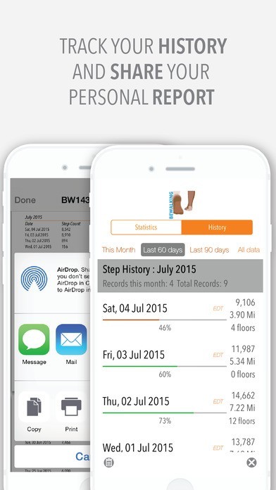 -あなたの毎日の歩行履歴統計上を歩くような手順、平均手順、全体的な手順を表示します。