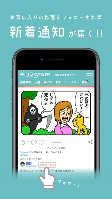 ◆お気に入りの作家さんが見つかったら、フォローすることによってその作家さんが新作をアップした時にあなたのスマホにプッシュ通知してくれます。好みの4コマ漫画を見逃すことが無くなります。