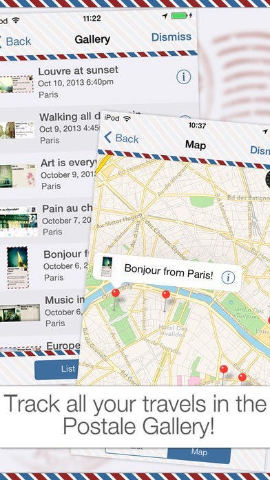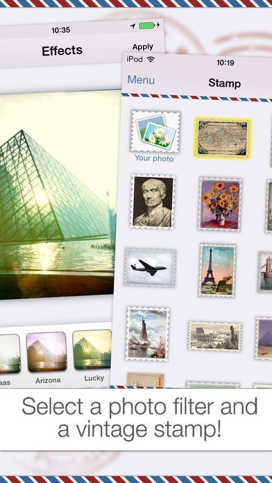 作成したポストカードには、20種類以上のレトロなスタンプを追加できます。また、カスタムスタンプを作成することが可能で、こちらは自身のカメラロールの写真を利用できます。