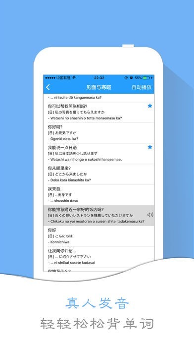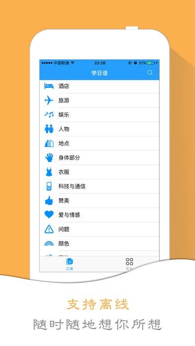 “学日语“为旅行者和初学者提供超过1300多句常用短语、词汇和句子。使用这个应用程序,您可以从中练习你的口语和听力,你无论何时何地。学习日语So easy~