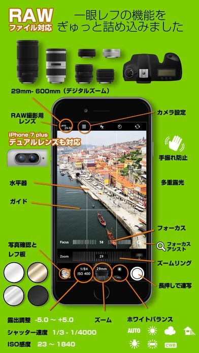 iOSデバイスに一眼レフ機能をつけることができます。RAWファイルやデュアルレンズも使えます。