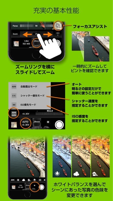 左右にスライドでズーム変更や、画面タップでフォーカスアシスト、ホワイトバランスの調整までできるので、本物の一眼レフカメラの機能をお手持ちのデバイスで体感することができます。