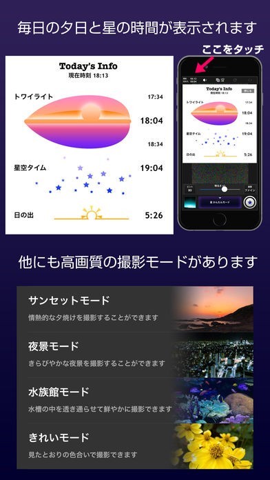 「星降るカメラ」の操作はとても簡単。スマホ画面を見ながら明るさを合わせて、ボタンを押すだけです。日没や星が出る時間も表示されます。旅行先に持って行けばとても役に立つカメラアプリです。