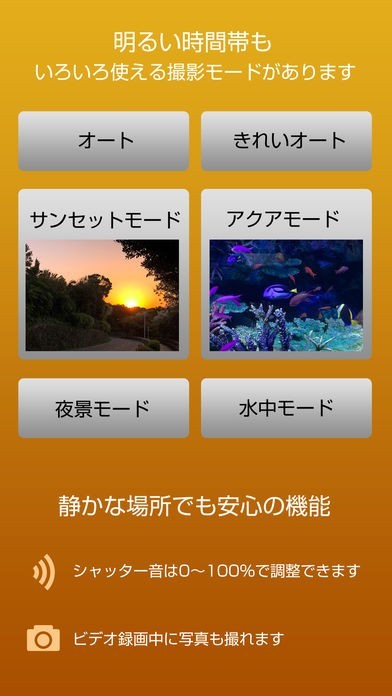 夕日の撮影に最適化した“サンセット”、水族館でキレイに撮るための“アクア”など六つのモードが用意されています。初心者でも簡単に使えて、撮影することが楽しくなるカメラアプリです。