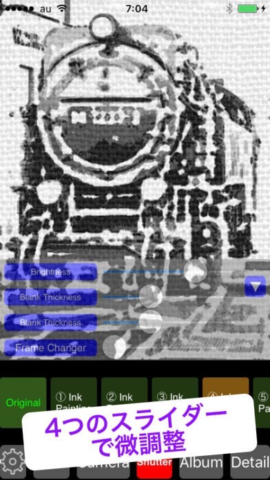 ポートレイト、風景、自動車、どんな写真でもタップひとつで水墨画風の味わい深い絵に変換できます。質実剛健といった感じの機関車も、柔和なスケッチ風に大変身!いろいろな写真に試してお気に入りの一枚を作ろう。