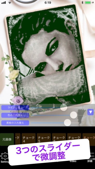写真をチョーク風に大変身させるためのポイントとなるのは3種類のスライダーです。それぞれのスライドの位置を微調整することによって色や黒板を入れ替えることができます。