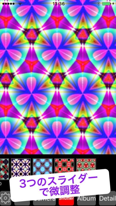 スライダーが3種類用意されているので、エフェクトのかけ具合を微調整して自分好みの万華鏡にすることができます。背景画像を変えることでも万華鏡の様子が変化していきます。