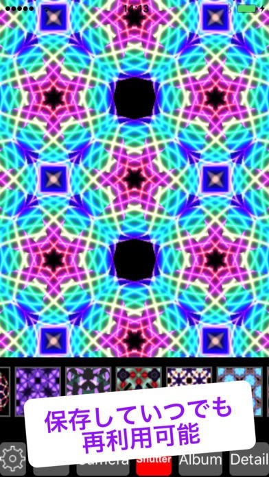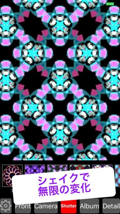 写真は端末をシェイクすることで万華鏡風に加工され、さらにシェイクすることで様々に変化していきます。変化の種類は無限なので、何度もシェイクして新しい画像を見て楽しむことができます。