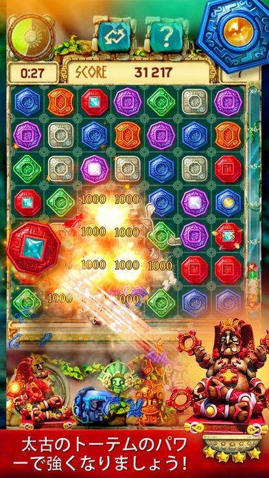 スワイプで3つの宝石を揃えることで、ポイントを獲得します。連鎖を起こすことができれば、ボーナスポイントが追加。特別な力を持つトーテムを最適なタイミングで使いこなして、高得点を叩き出しましょう。