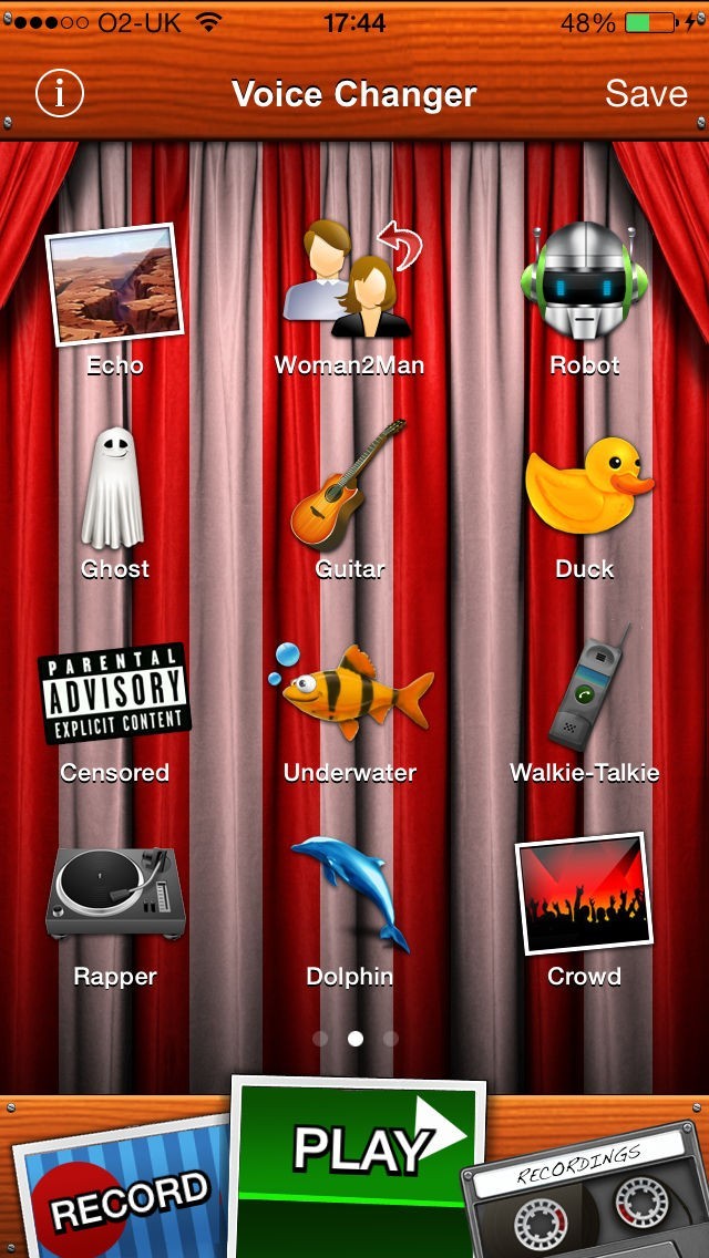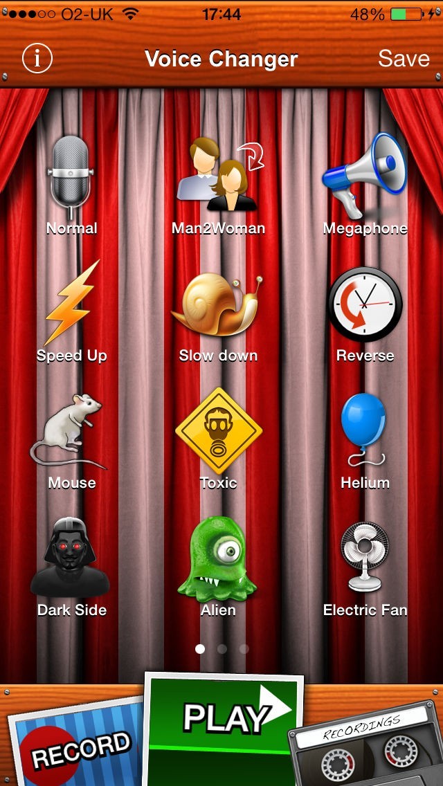 App Storeより引用あなたの声をボイス・チェンジャーで変えよう。録音ボタンをタップすると、後は25を超える面白いサウンドエフェクトからひとつ選ぶだけ。