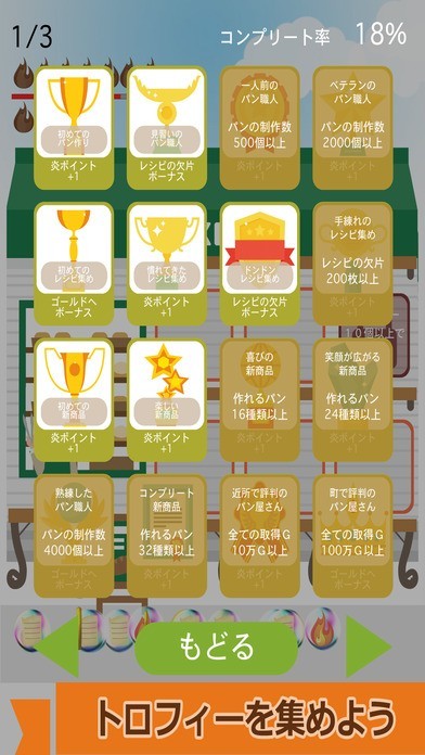 色々な条件を達成するとトロフィーを獲得して、ゴールドや炎ポイントの回復、レシピの欠片の発生などのボーナスを得られるようになり、より快適なパン屋運営ができるようになります。