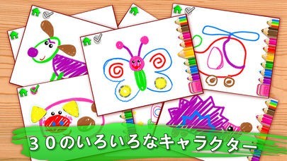 お絵かきの方法は可愛いキャラクターの線をなぞって絵を完成させるだけです。完成した絵は動いてゲームに登場させることができます。子どもは絵を完成させようと夢中になって絵を描く練習をします。