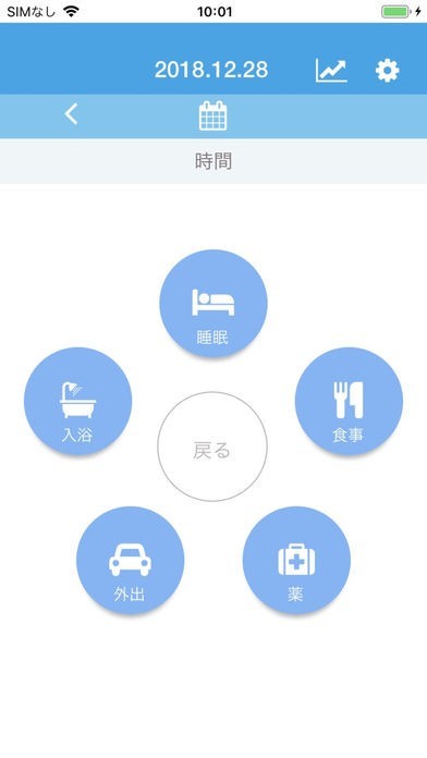 一日の行動で必要となる行動をカテゴリ化して、記録時には「今」ボタンを押せばその時間が自動的に登録されます。修正したい場合は「入力」ボタンを押せば修正可能です。長押しで削除されます。時計をみる必要はありません。右上のアイコンから登録直後の1週間の記録がカテゴリごとに確認できます。