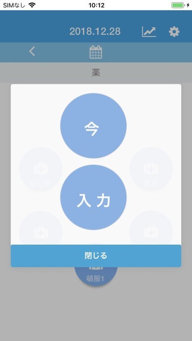 こちらも一日で必要となる薬をカテゴリ化して、記録時には「今」ボタンを押せばその時間が自動的に登録されます。修正したい場合は「入力」ボタンを押せば修正可能です。長押しで削除されます。時計をみる必要はありません。同じく右上のアイコンから登録直後の1週間の薬の記録が確認できます。